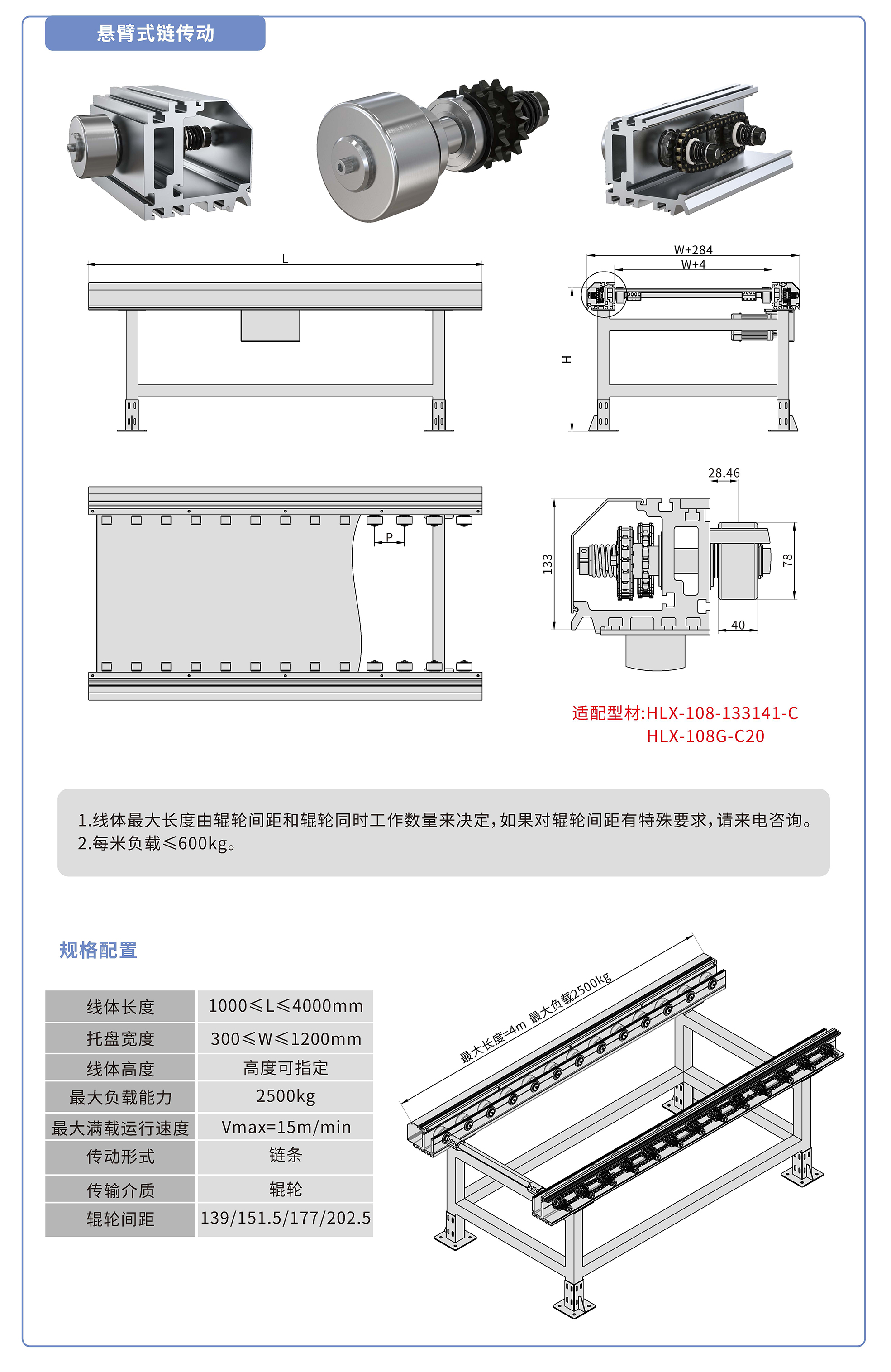 采用133141鋁型材,鏈輪傳動(dòng),鍍鉻滾輪鑲嵌銅套實(shí)現(xiàn)積放功能,負(fù)載2500kg/米,最大負(fù)載速度15M/min, 輪距139、151.5、177、202.5可選,適用托盤寬度300-1200mm,線體長(zhǎng)度范圍1000-4000mm, 高度根據(jù)需求定制.