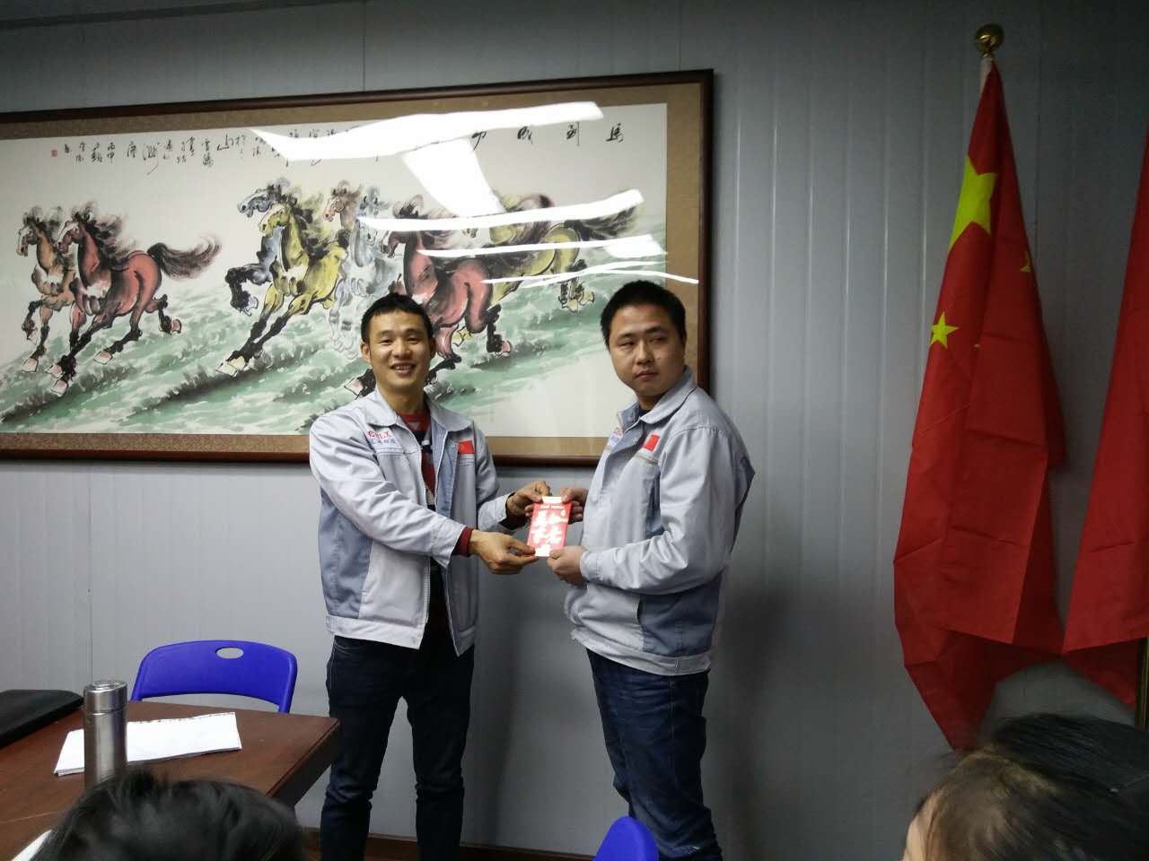 大會進行到尾聲,對每月度之星的選舉。胡總(圖左)為月度之星徐財華戰(zhàn)士(圖右)頒發(fā)獎金。同時感謝他對于公司的無私奉獻,對于同事的無微關懷,并擁護匯利興這個大家庭;同時匯利興還有很多人都在默默地奉獻與努力(例如:成都辦事處的張國桃經(jīng)理,在今年6月17日與戰(zhàn)車傳奇進軍成都開疆擴土、奮戰(zhàn)近一年),在此感謝他無私的奉獻。匯興智造有著你們這群人的努力與付出,相信我們會更加靠近我們的夢,實現(xiàn)中國智能裝備全產(chǎn)業(yè)鏈集成智造標桿,繼續(xù)引領行業(yè)的發(fā)展。