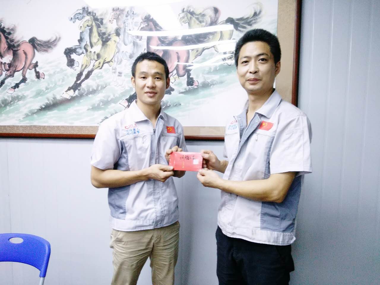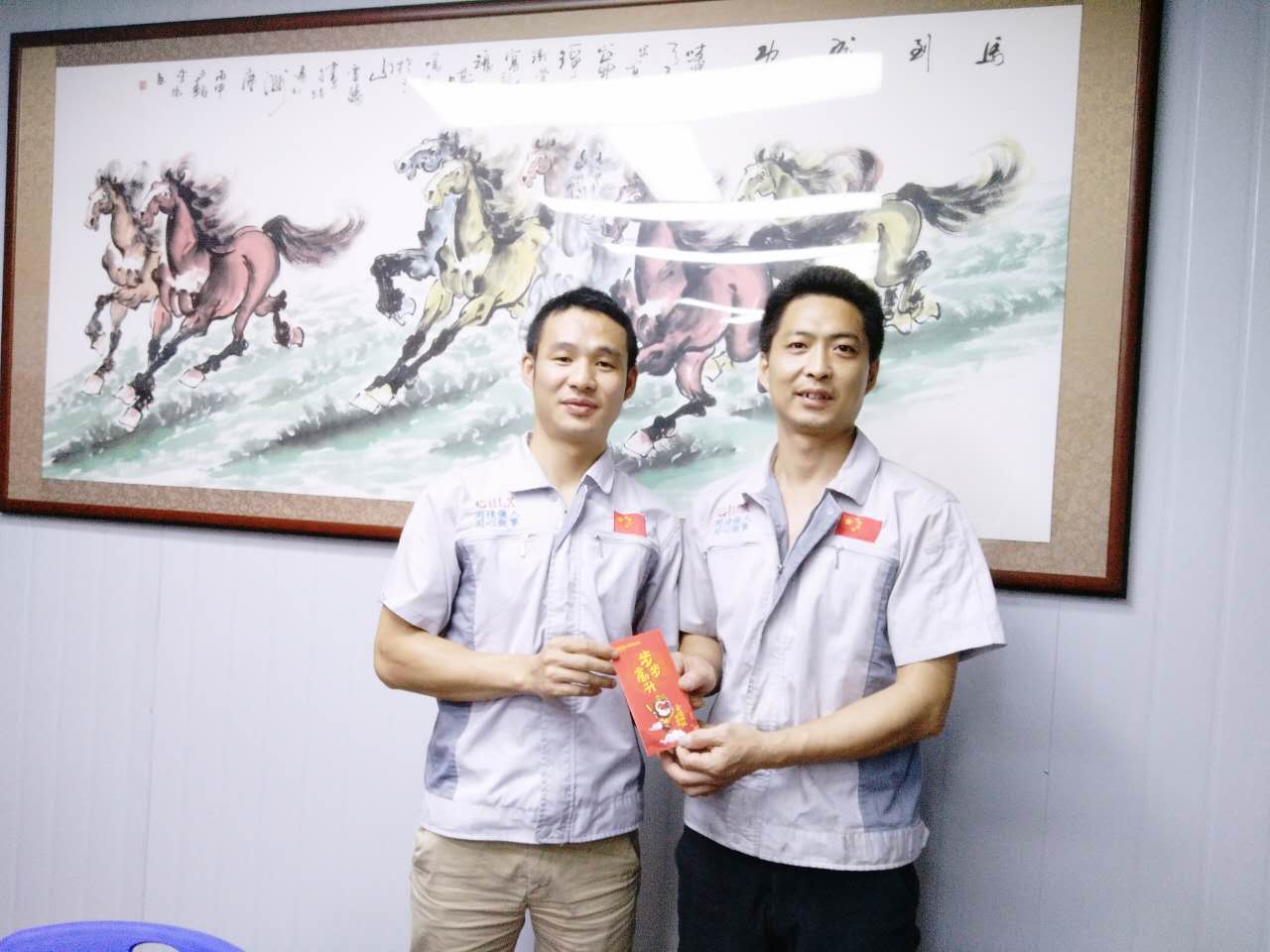 胡總經(jīng)理(左)為物控部代表王文奎(右)頒發(fā)部門獎金