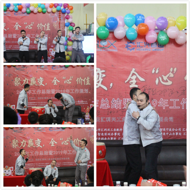 《開門紅》舞蹈 緊接著是一場聽覺的盛宴,胡總和胡前敏家人帶來的詩朗誦,貫穿著唯美的中國風韻,溫和而又親切的聲音屢現(xiàn)耳旁,字里行間都展示了感恩之心的重要性。 小品《推銷》,銷售部家人演繹的惟妙惟肖,穿插著銷售部全體家人精神面貌,一聲聲“為夢想沖刺,我是匯利興的一名忠誠戰(zhàn)士”,現(xiàn)場士氣高昂、力量雄厚;從側面展示了雖一路挫折無數(shù)坎坷無數(shù),但決不放棄的信心與理念,并將公司精神面貌鮮活的展現(xiàn)在眾人面前,為他們點贊! 點燃全場的一曲《相親相愛一家人》,物控部每位家人相互搭肩,每個人都唱出了自己的心聲,我們是一家人,相親相愛的一家人,希望家人們在2019年不忘初心,再出發(fā)。