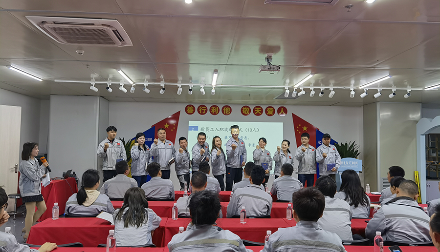 會(huì)議開始,三位高管敲響2021年征程的號(hào)角,鼓聲震天,士氣如虹,潛移默化鼓舞著戰(zhàn)友們奮勇前進(jìn),并以這種以評(píng)促進(jìn)、你追我趕的“激勵(lì)文化”,鞭策著員工們不斷爭(zhēng)先創(chuàng)優(yōu),推動(dòng)企業(yè)發(fā)展內(nèi)生動(dòng)力,從而形成“我來干、搶著干、努力干”的工作作風(fēng)。 會(huì)議第一項(xiàng),企業(yè)文化展示。全體員工整肅衣冠,對(duì)倍加推崇的孝道、商道、人道鄭重鞠躬,莊嚴(yán)宣誓企業(yè)愿景:“成為行業(yè)優(yōu)秀的智能自動(dòng)化產(chǎn)業(yè)鏈集成服務(wù)商”,企業(yè)使命:做受尊敬的好人,造受尊敬的產(chǎn)品,辦受尊敬的企業(yè),建受尊敬的平臺(tái),企業(yè)精神“用情做人、用心做事”,團(tuán)隊(duì)精神“忠誠(chéng)團(tuán)結(jié)、勤奮進(jìn)取”,工匠精神:創(chuàng)于手、精于工、智于器、匠于心、品于行等。 會(huì)議第二項(xiàng)。新員工入職歡迎儀式,培育新生力量,助力企業(yè)發(fā)展,增強(qiáng)企業(yè)核心競(jìng)爭(zhēng)力,強(qiáng)化人才建設(shè)梯隊(duì)。由客服部經(jīng)理石樂歡為新入員工頒發(fā)紀(jì)念品。