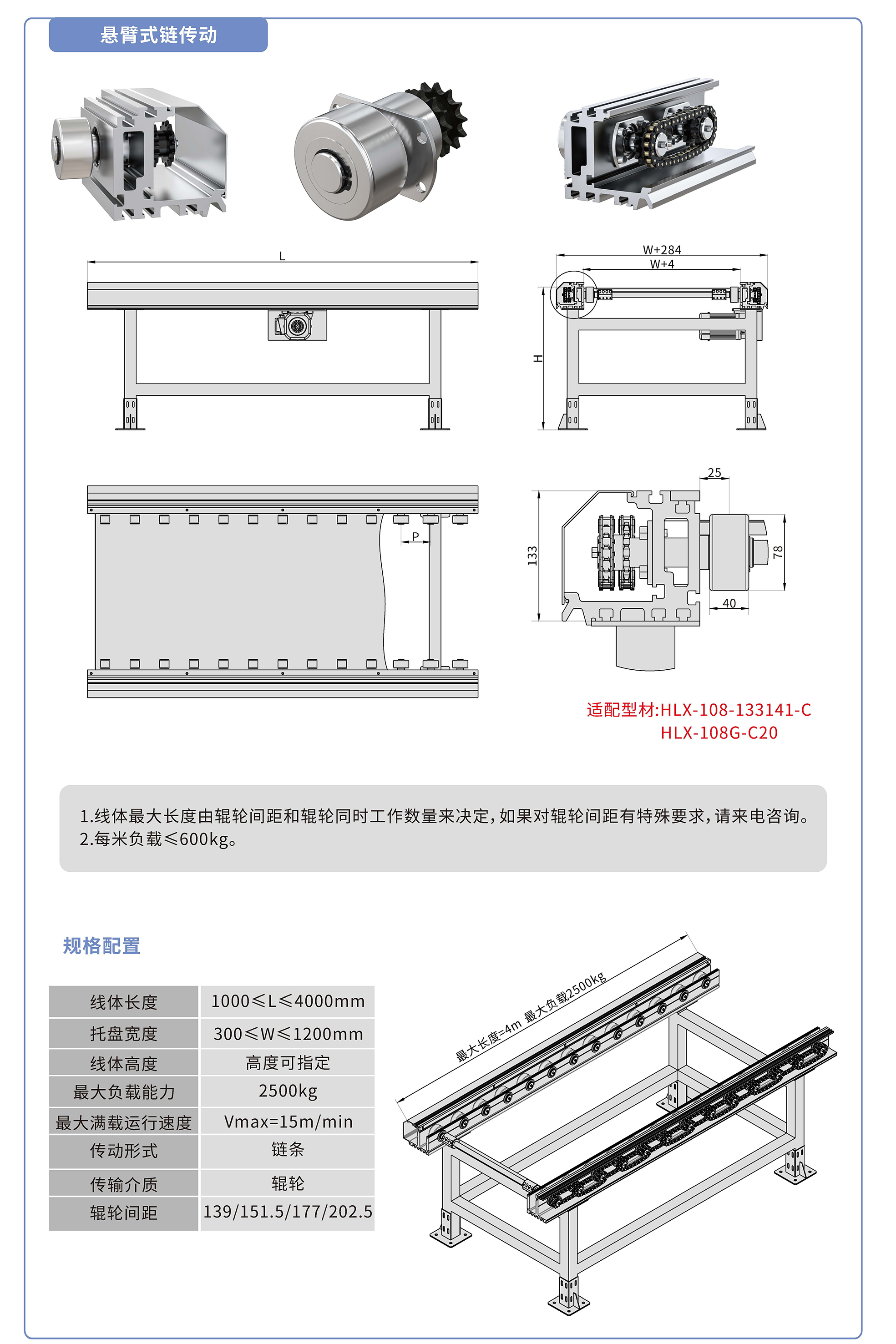 采用133141鋁型材,鏈輪傳動(dòng),鍍鉻滾輪鑲嵌銅套實(shí)現(xiàn)積放功能,負(fù)載2500kg/米,最大負(fù)載速度15M/min, 輪距139、151.5、177、202.5可選,適用托盤寬度300-1200mm,線體長度范圍1000-4000mm, 高度根據(jù)需求定制.